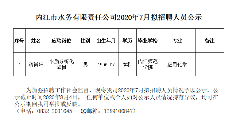 內(nèi)江市水務有限責任公司2020年7月擬招聘人員公示