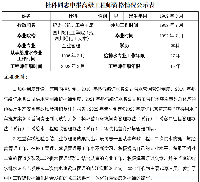 根據(jù)《四川省建設(shè)工程技術(shù)人員職稱申報評審基本條件》(川建行規(guī)〔2023〕3號)的規(guī)定,經(jīng)審查,杜科同志符合申報條件。為體現(xiàn)公開、公平、公正原則,接受社會公眾監(jiān)督,現(xiàn)將其個人基本情況等材料予以公示,公示期為2023年10月7日至10月11日。如有不同意見,請于公示期內(nèi),以書面形式向公司人力資源部反映。