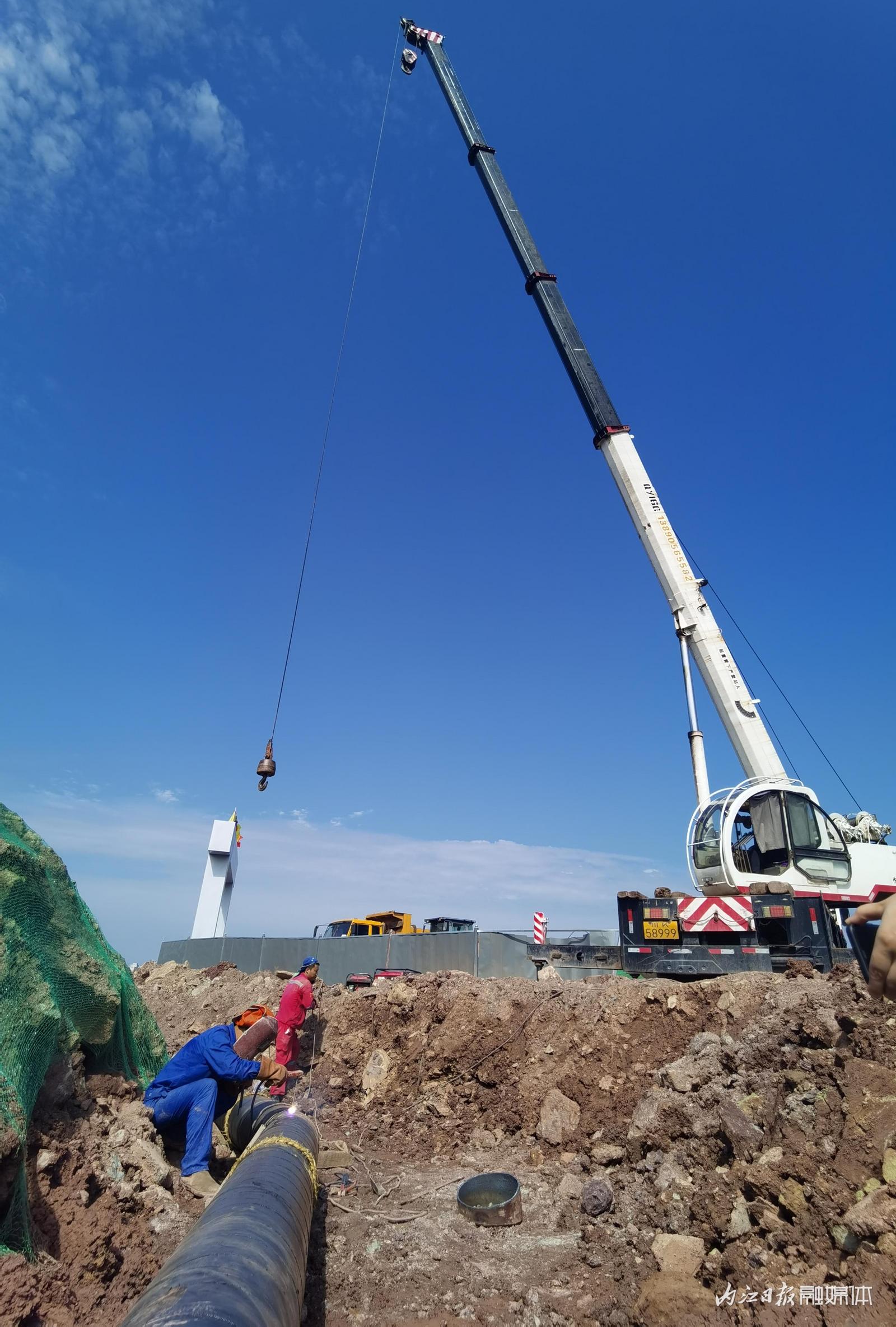 現(xiàn)場(chǎng),機(jī)械聲轟鳴,大型挖掘機(jī)正在馬路邊開(kāi)溝挖槽,大型吊車(chē)將管道吊到挖好的溝槽內(nèi),由施工人員逐節(jié)進(jìn)行焊接……分工明確,專業(yè)有序,白晃晃的陽(yáng)光下,工人們揮汗如雨,衣服早已濕透。