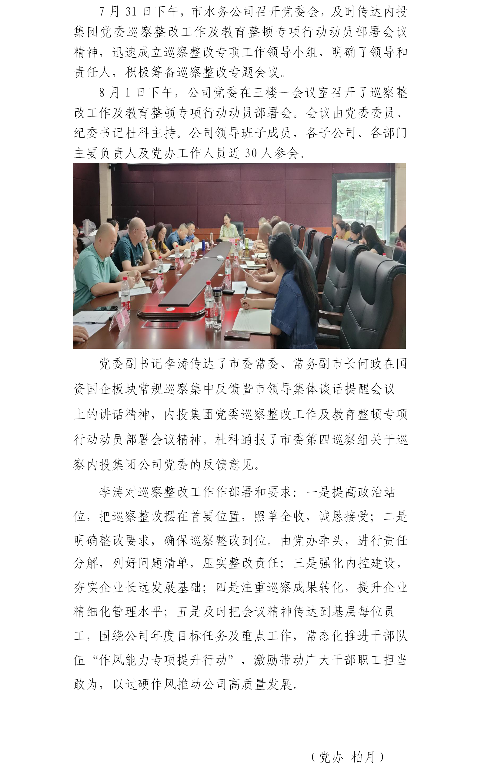 內(nèi)江市水務有限責任公司黨委召開巡察整改工作暨教育整頓專項行動動員部署會