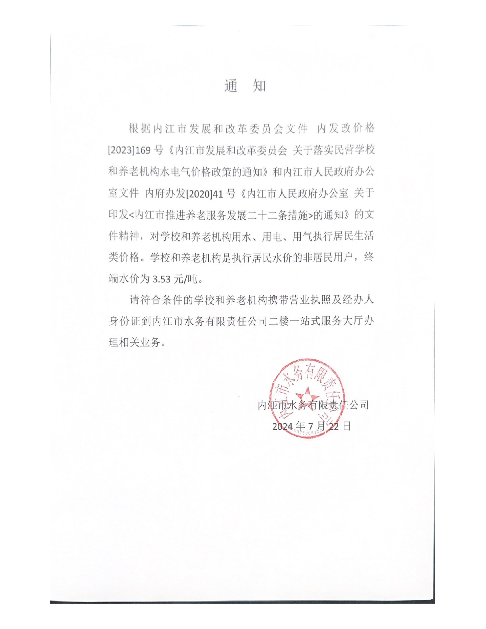 內(nèi)江市水務(wù)有限責(zé)任公司關(guān)于養(yǎng)老機構(gòu)、學(xué)校執(zhí)行生活用水價格的通知