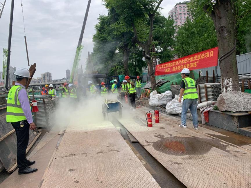 本次演練以上游及本市突降特大暴雨、沱江河水位猛漲、并倒灌鋼板樁圍堰內(nèi)、水位持續(xù)上升、嚴重威脅現(xiàn)場施工安全為背景。演練過程中,現(xiàn)場作業(yè)人員及搶險救援人員聽從項目經(jīng)理指揮,協(xié)同配合,現(xiàn)場人員有序撤離,并立即啟動排水泵,緊急調(diào)用潛水泵進行增援,對圍堰內(nèi)積水進行抽排。