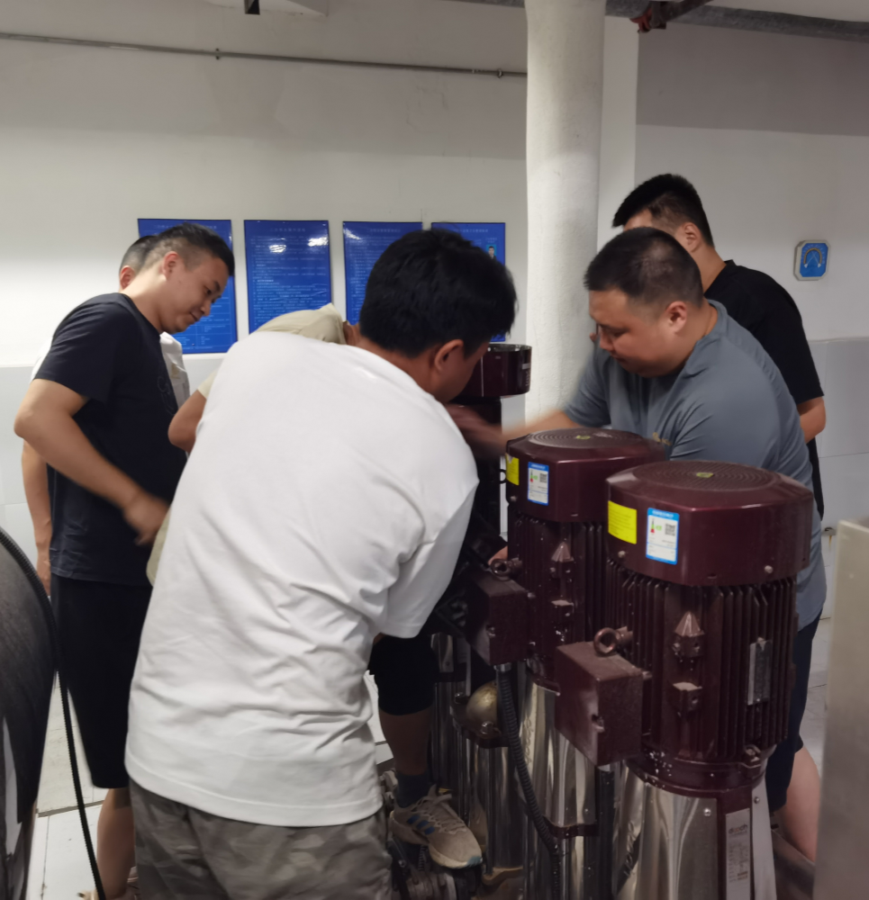 6月中旬,該小區(qū)有用戶反映水壓不穩(wěn)定。豪鵬二次供水公司收到信息立即組織人員前往現(xiàn)場排查,確認是一臺水泵電機出了故障,引發(fā)電壓波動所致。面對突發(fā)情況,公司迅速響應,立即組織人員對故障電機進行拆解維修。6月17日下午,維修工作進入電機重新安裝的關鍵階段,公司抓住這次實戰(zhàn)機會,組織5名青年員工參與到此次技術(shù)練兵。通過此次培訓,員工們不僅掌握了電機維修與安裝的相關理論和維護技巧,更在實戰(zhàn)中深化了對二次供水設施運行原理的理解。