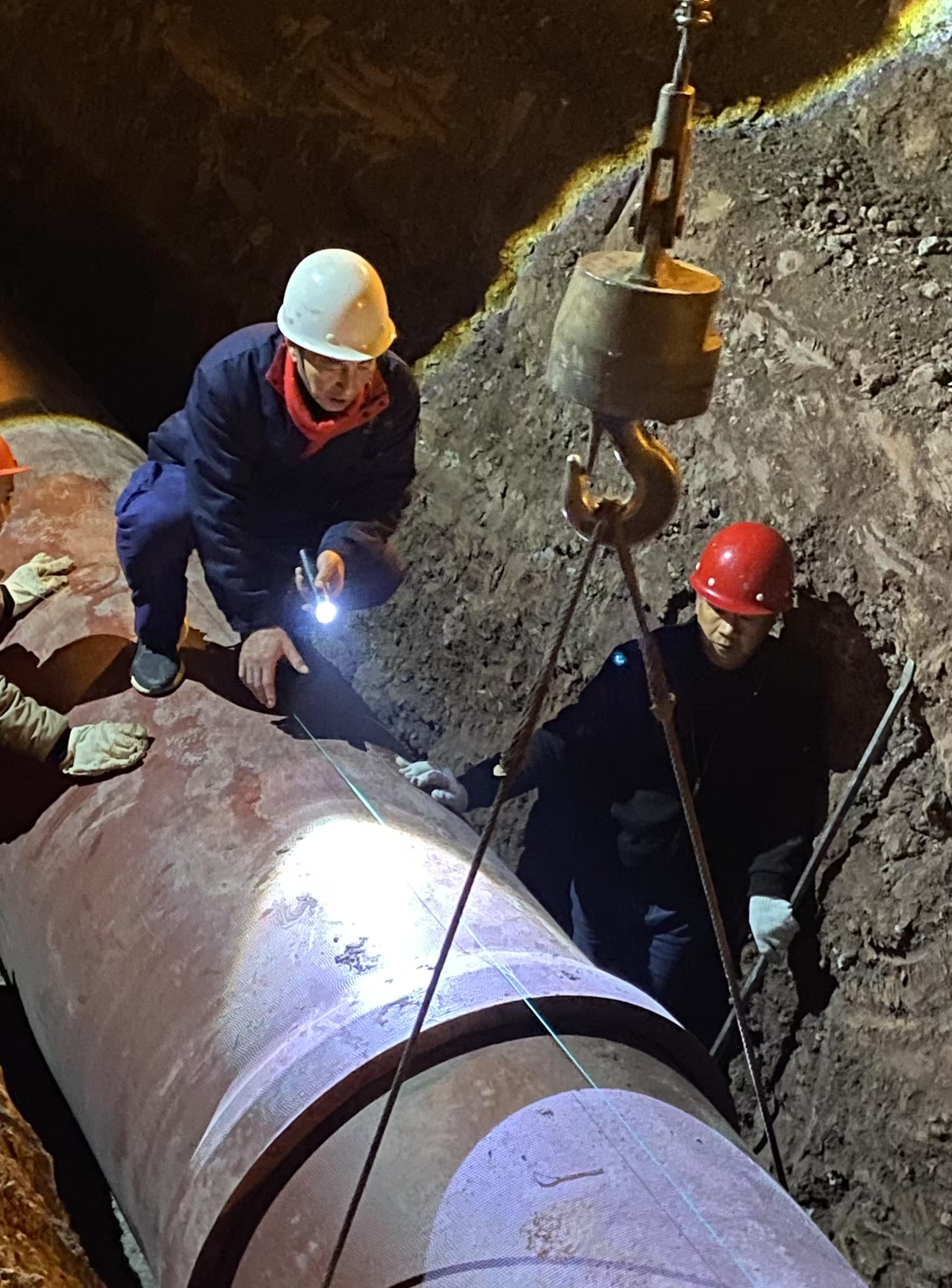 在寒風中,工人們用雙手熟練地操作著各種冰冷的機械設(shè)備,進行著五河路到大千路口段污水管網(wǎng)鋪設(shè)工作。他們始終將質(zhì)量放在首位,一次次地調(diào)整管道位置,確保每一根管道拼接合攏、無縫連接,每一根管道的連接。他們用實際行動詮釋了水務(wù)人的責任、擔當與堅守。
